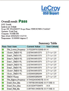 As hardware designers are quick to recognize, measurement results often need to be summarized and tabulated for quick specification verification. These test results, together with instrument and signal acquisition/test condition setups, create a fully documented record. SDA-HDMI incorporates a multipleformat report generation engine. This test report contains tabulated numerical values for each individual test result including PASS/FAIL and specification limit columns.