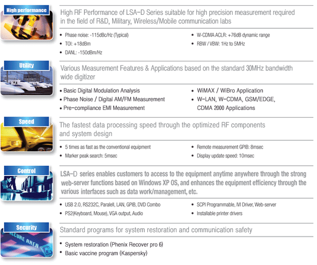 The widest 30MHz bandwidth digitizer in its product ranges as well as the basic digital modulation analysis S/W. Its 30 MHz standard digitizer provides the optimized H/W conditions for various mobile and wireless communication measurements such as WiMAX/WiBRO etc.