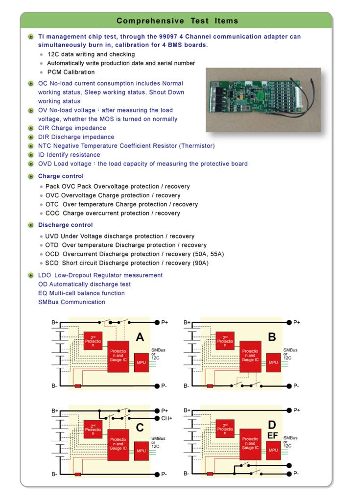 internal resistance, working current consumption, battery cell balance, NTC simulation, various over or under voltage, over