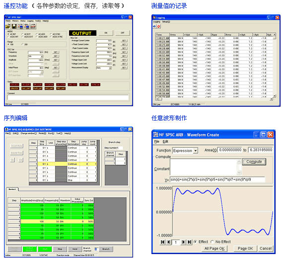 | 附属的控制软体具有如下功能: ● 便捷的 “记录功能 ”,可读取和保存测量资料,便于编制报告、进行资料分析; ● “ 序列功能 ”可自由地进行一系列输出变化模式的编辑、执行、保存等; ● “ 任意波形制作功能 ”可简单地制作复杂的波形。无论在产品开发或试制时,都能使测试和测量得到全方位和高水准的支持。 | |