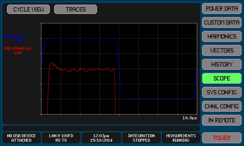 The cycle view represents a single cycle of the voltage and or current periodic waveforms. The above waveforms represent a full 10V square wave in blue and a 50:1 zoomed in view in red. Since the user sets amplitude and scaling – the result is an almost unlimited ability to amplitude zoom to expose fine detail. The sampling is forced to be asynchronous to higher order harmonics which leads to an effective sampling rate of 384MSPS.