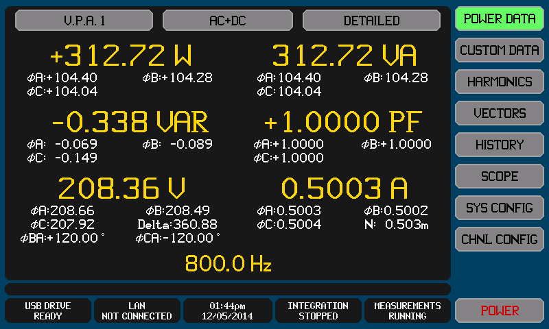 The power data screen, available with one touch, displays V, A, W, VA, VAR and PF data for any selected channel or group of channels known as a Virtual Power Analyzer™ (VPA). Up to three different VPAs can exist in in a single PA920. In addition to the primary data, peak readings, phase, CF and other parameters are also available. Integrated data results (WHr) can also be controlled and viewed from the power data screen. For users with unique data requirements, custom data screens can be built with a spreadsheet application and downloaded to the PA920 via interface or USB drive.