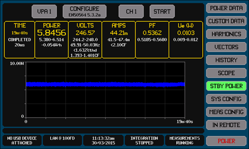 The PA920 features built in standby power testing in accordance to EN50564:2011 (replaces IEC62301) which can be started with the press of a finger from the STBY POWER screen. All information is neatly organized onto a single screen for easy viewing and can just as easily be saved as an image file into a connected USB drive to add into any report. Various measurement methods laid out in EN50564:2011, minimum test time, and datalogging capability are all selectable. The PA920 also has the ability to perform standby power measurements independently in each configured VPA.